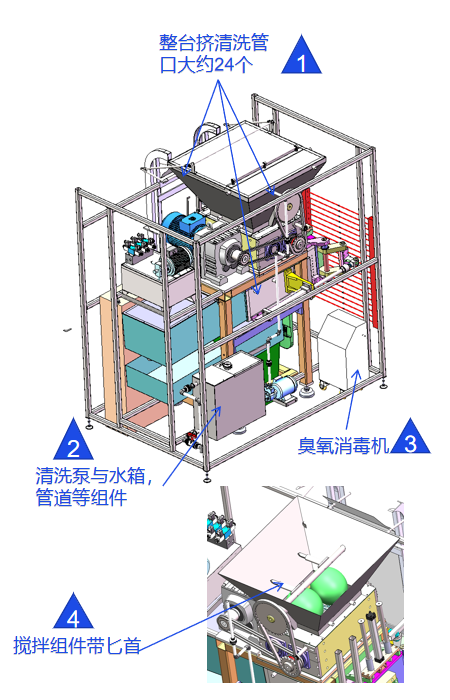 高压清洗,100多个清洗喷头,可清除角落等位置残渣,防止发酵、发臭;