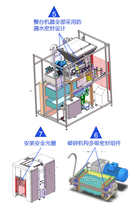 1. 我们会在整台机器的,料斗,破碎,挤压等 核心区域,增加密封胶垫与打防水胶,见图标记5处